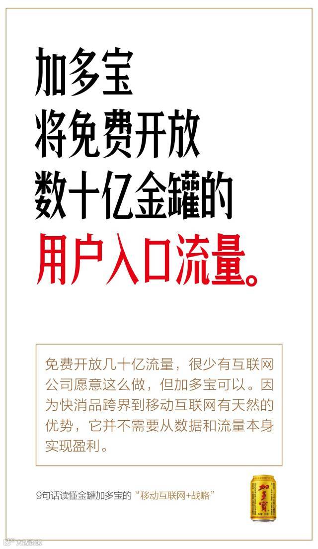 免费开放几十亿流量,很少有互联网公司愿意这么做,但加多宝可以。因为快消品跨界到移动互联网有天然的优势,它并不需要从数据和流量本身实现盈利。