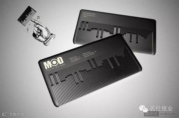罗马MODhair美发沙龙的一个名片设计。A groovy business card for Rock ‘n Roll hair salon in Rome. This comb plays a classic rock theme when rubbed by fingernail, using the same principle of a musicbox comb. (Advertising Agency: Fabio Milito design, Roma, Italy)