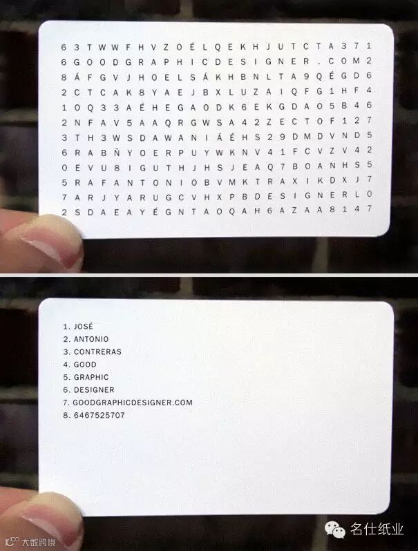 为了得到这个名片上的联系人信息,你必须解决一个小的文字谜语。幸运的是,名片的背面上有提示。In order to get the contact information on this business card, you have to solve a little word puzzle. Luckily, there are hints on the back of the card. (Designed by Jose Antonio Contreras)