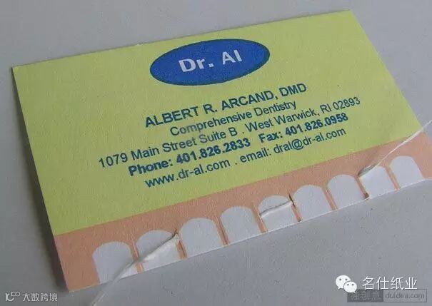 这是一名牙医的名片。Dentist’s business card with an included dental floss.