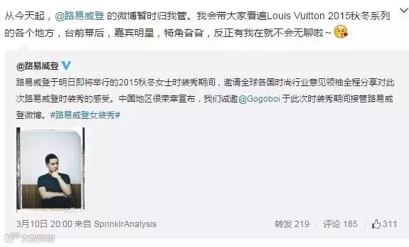 2015 年3月11日路易威登在新浪官方微博宣布Gogoboi在时装秀期间接管路易威登新浪官方微博,新浪微博是LV全球社交媒体推广计划的一部分,同期接管 twitter和instagram的还包括LV创意总监Nicolas Ghesquière和全球其他时尚博主(如下图)
