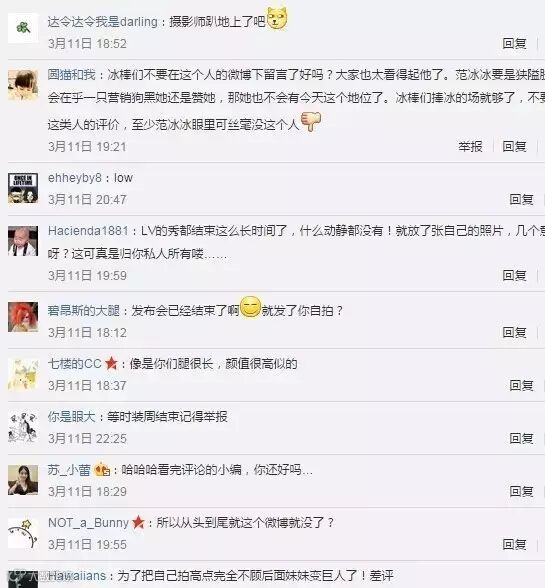秀场结束之后跟其他博主比较,gogoboi一共用路易威登官微发了3条微博,引起争议的焦点有3个方面:没有按照承诺全面直播这场大秀而是P图过分秀自已,秀场不专注点评不专业;中国第一个采访LV创意总监的媒体代表不符合事实。
