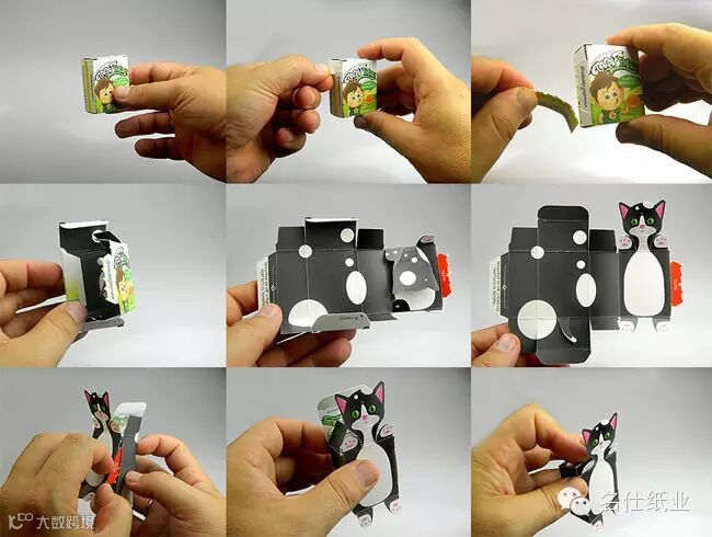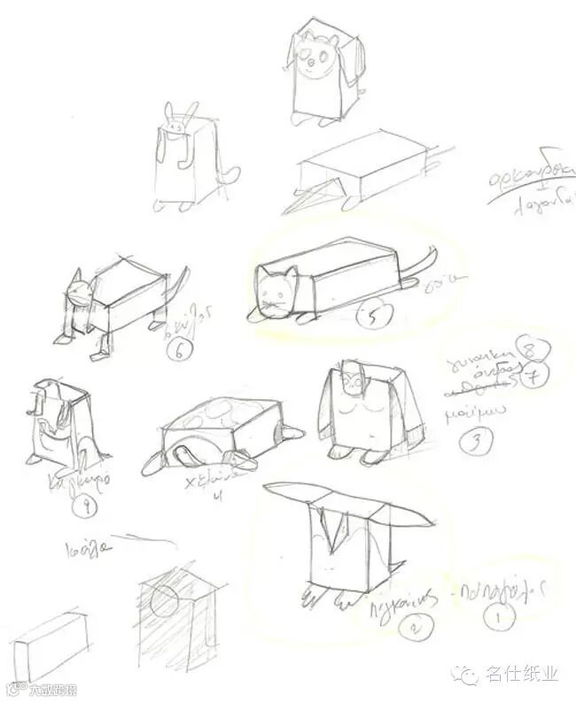 需要在一个低成本的包装上实现以上的目标,确实是一个挑战,我们可以看到,最初客户及设计公司只是考虑在包装内附玩具,这种手法是非常通用的,事实证明也是有效的,经典的如“健达奇趣蛋”,这种蛋形产品一半是牛奶巧克力,一半内装有拼装玩具。但这样就可能会导致整个产品成本的上升。而最后采用的通过包装自身折叠成的折纸形象,可以说是一个非常有创意的做法。以下是一些草图及试验的盒子图片: