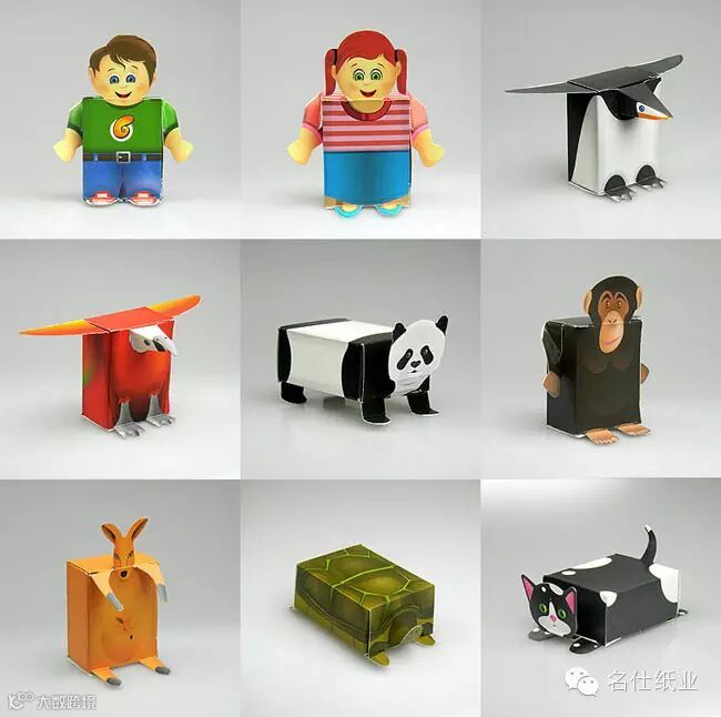 最后,形成了十款不同的折纸图案,两款男女呼应包装人物图案,其余的动物形象为猫、狗、熊猫、鹦鹉、企鹅、乌龟、猴子及袋鼠。