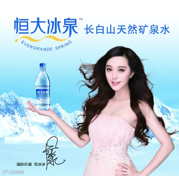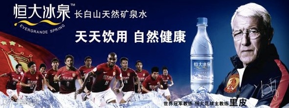 2013年11月9日借亚冠夺冠高调推出的产品“恒大冰泉矿泉水”,邀请世界名帅里皮作为自己品牌矿泉水的形象大使的同时,还邀请国际巨星菲戈、耶罗,和中国女排主帅郎平出任全国推广大使。