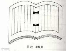 蝴蝶装 将每页书在版心处对折,有文字的一面向里,再将若干折好的书页对齐,粘贴成册。采用这种装订形式,外表与现在的平装书相似,展开阅读时,书页犹如蝴蝶两翼 飞舞,故称为蝴蝶装(图4)。蝴蝶装是宋元版书的主要形式,它改变了沿袭千年的卷轴形式,适应了雕版印刷的一页一版的特点,是一重大进步。《明史艺文志》 序称秘阁书籍皆宋元所遗,无不精美。装用倒折,四周外向,虫鼠不能损。"但这种版心内向的装订形式,人们翻阅时会遇到无字页面,同时版心易于脱落,造成掉 页,所以逐渐又为包背装取代。