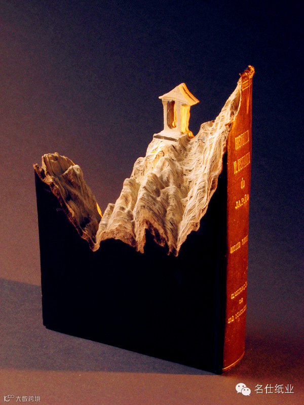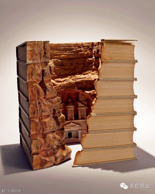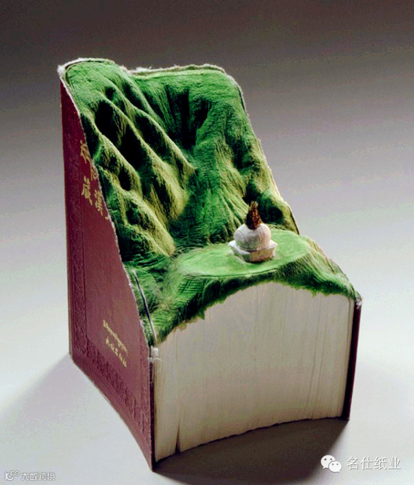 “我把图书雕刻成那些自然风景,然后涂上浪漫的色彩。被遗忘的知识山峰,得到循环变成真的山的形状。一大摞百科全书呈现自然的风景,默默的不用多说什么。”