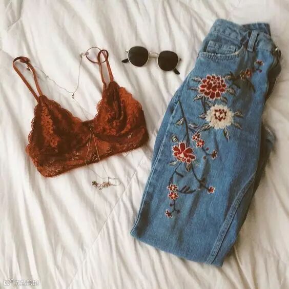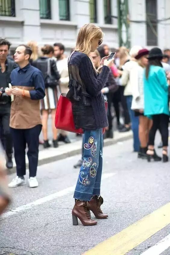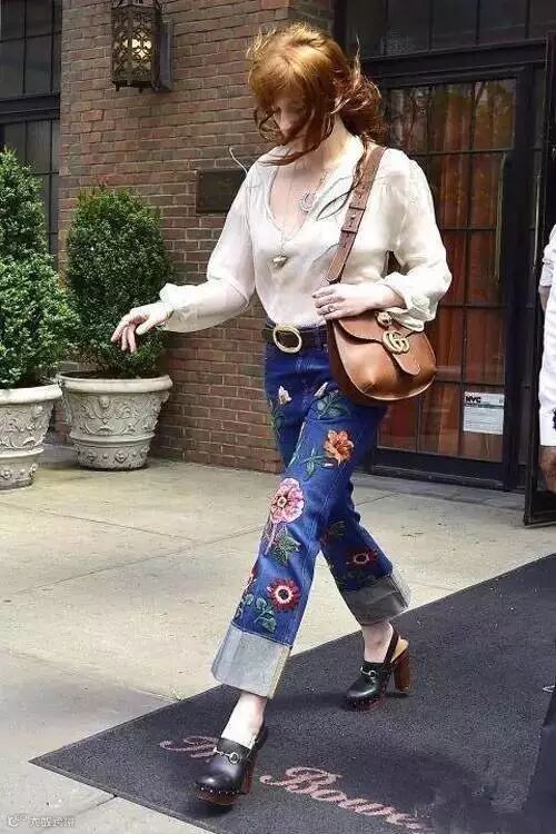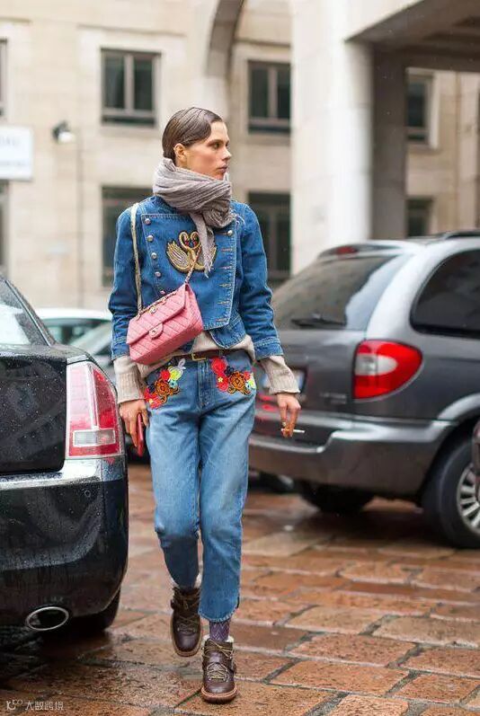 方跟鞋、乐福等复古款式和刺绣牛仔裤很搭,当然选择运动casual的波鞋也很不错。