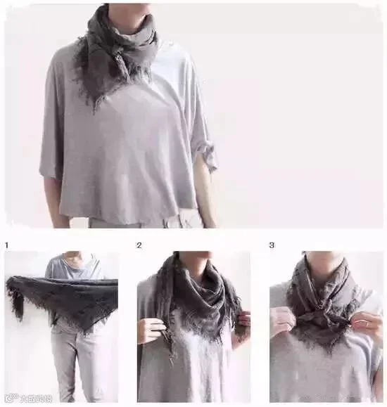 大的方形丝巾,先对折再从前往后围,绕一圈后把尾部打个结