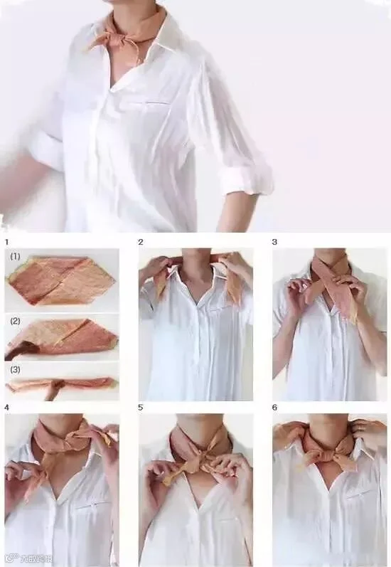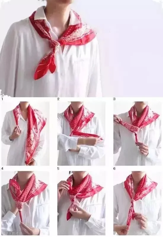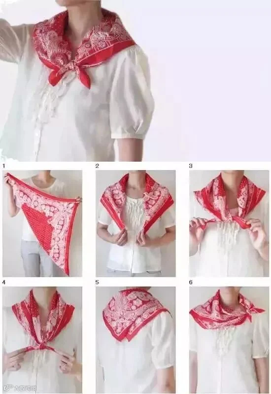 对于小方巾,先按图示折叠成条状,然后直接围上打个结