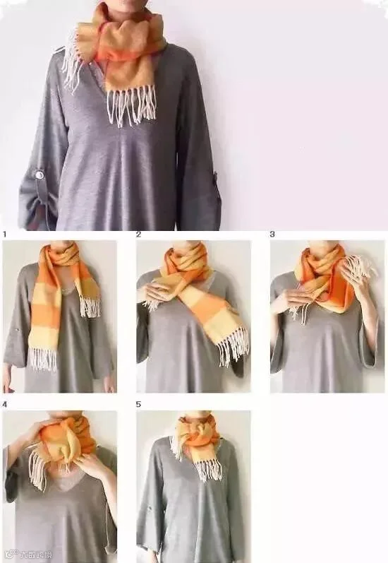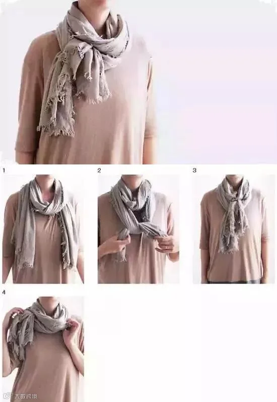 先将围巾两端打个结变成一个圆,然后套进脖子,套两圈