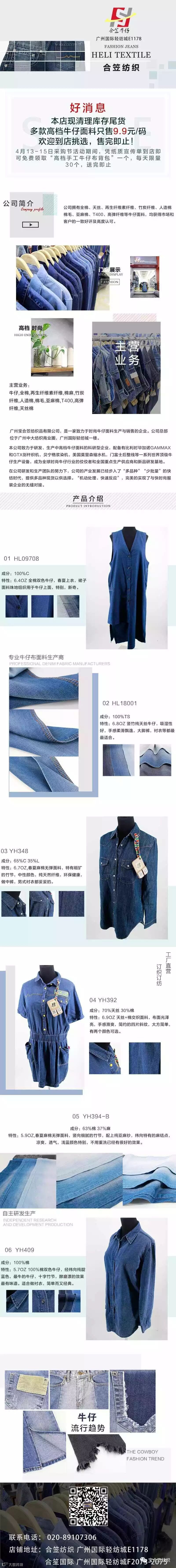 本公司位于广东广州市海珠区中大,常年生产并对外销售全棉牛仔面料、针织牛仔面料、色织牛仔面料、天丝牛仔面料、印花牛仔面料、提花牛仔面料、弹力牛仔面料、彩拔牛仔面料等产品