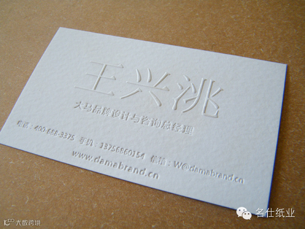 整张名片没有一点印刷油墨,全部是使用击凸和压凹技术,纸张克重350克,手感超级好,薄厚也非常适中,远看就是一张白纸,近看可以看到字。