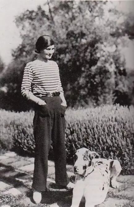 (1930年,CHANEL穿着条纹上衣,在家门口拍摄的一张照片)