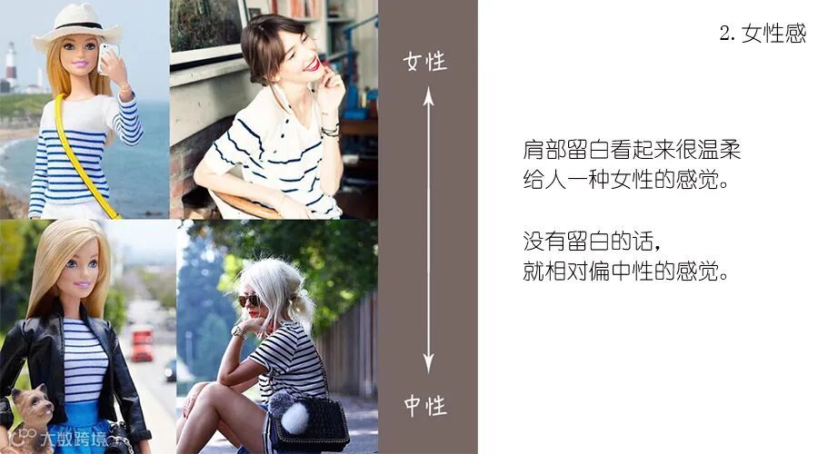 在显身材方面,横条纹在视觉上横向拉伸你的身材,因此X型身材的人可以很好地驾驭横条纹单品,利用横条纹的横向视觉延伸,延长肩线,增加上身量感,将纤细的腰身简洁地修饰出来。