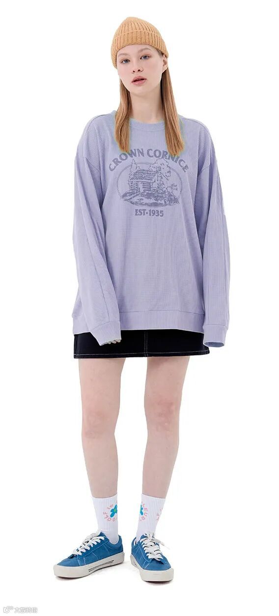 澳粒格的polo衫,直筒丹宁裙+运动鞋的搭配,展示了“宅时尚”穿搭风格。