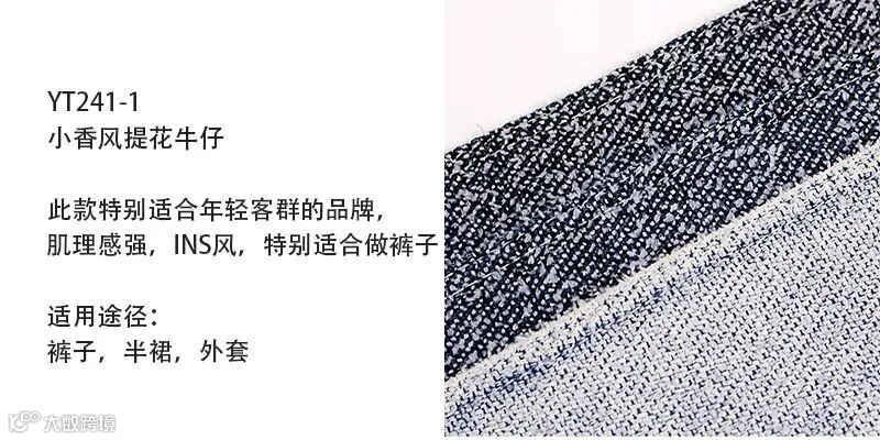 提花牛仔:提花是指机器上用不同的工艺使面料具有不同的条纹、形成花型,有凸凹感,对原材料的要求高,成品更具高级感