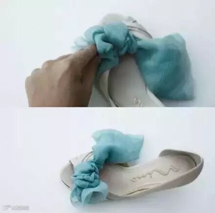 动动双手,几分钟就能给鞋子换个颜色湖蓝色的丝巾系成蝴蝶结,这样梦幻的鞋子我也想来一双。