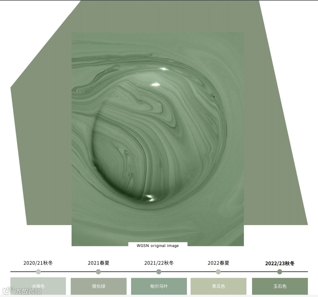 色彩要点:随着消费者开始关注身心健康的平衡,自然 滋润的绿色调将持续流行。翡翠色是具有跨季节吸引力 的经典中间色调。其蓝基调带来镇静底色质感。翡翠作 为亚洲的一种珍贵矿石,拥有悠久的历史,与心轮相 连,自古以来一直是智慧、勇气和平等的象征。