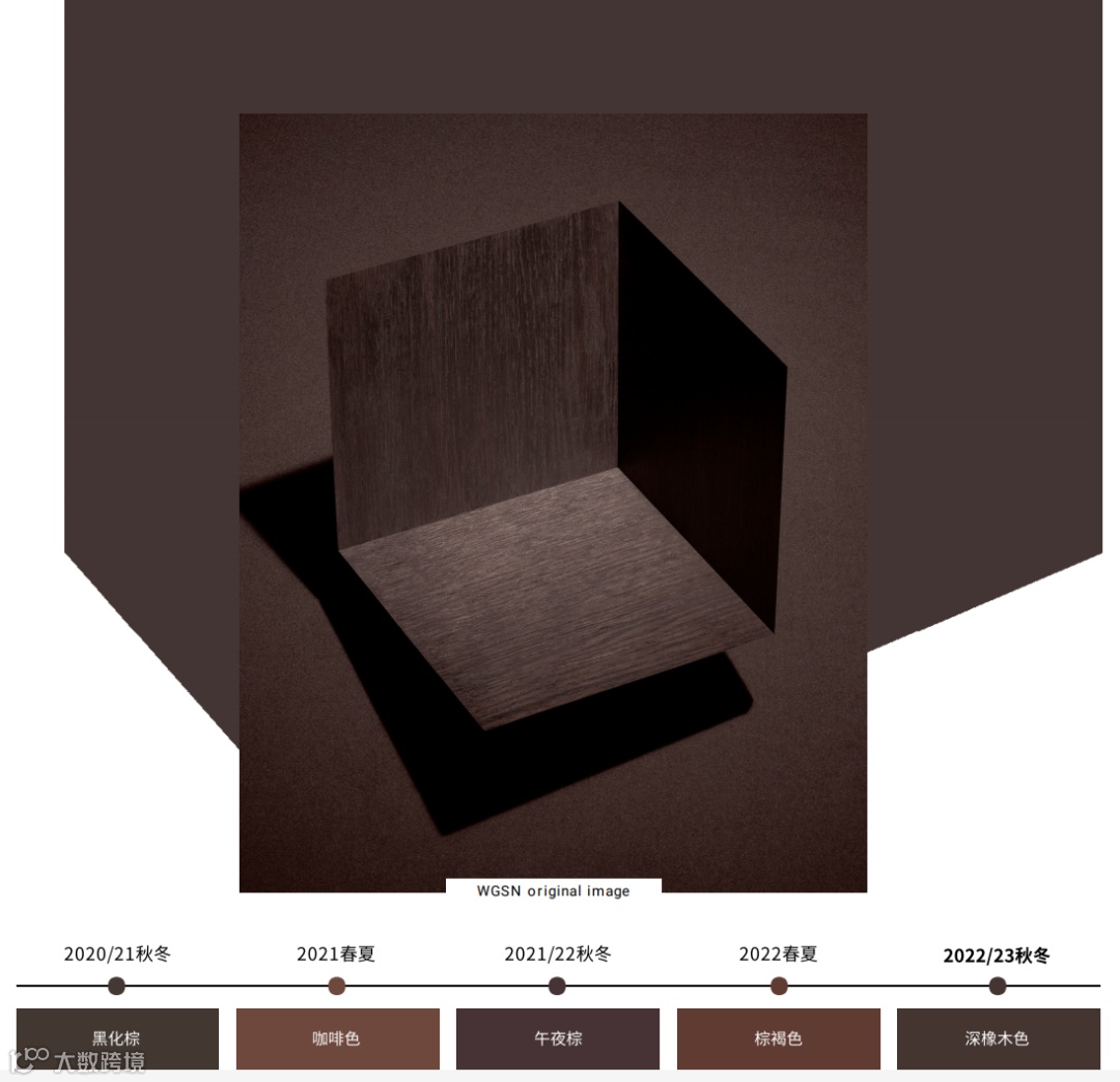 色彩要点:潘通预测了棕色的增长,并见证了其近期的快速发展,数据显示了该色在配饰和鞋品类别销量的上升。充满挑战的经济和对慢时尚的需求使其保持流行。深橡木色经久不衰,演化自我们在2021/22秋冬趋势预测中的黑色调。这一怀旧色彩以深色涂料和古董饰面为灵感。