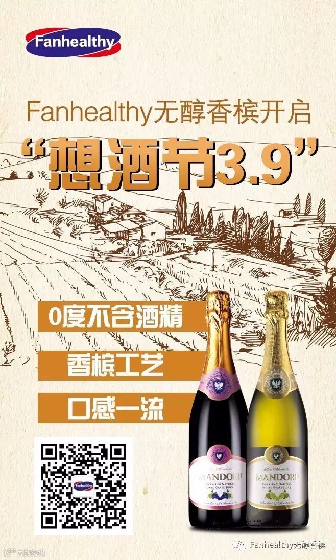 3月9日,Fanhealthy无醇香槟开启“想酒节3.9”产自澳大利亚猎人谷万福山庄的Fanhealthy无醇香槟,0度不含酒精,香槟工艺~口感一流,这一天你将以一个意想不到的钜惠价体验澳洲风情的无醇香槟!不醉,原来也可以细品~