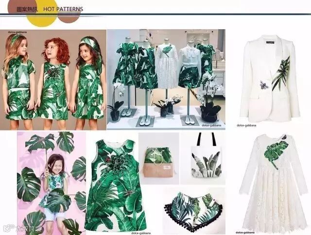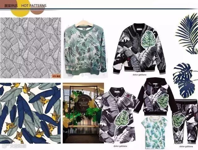 阔叶植物如芭蕉、棕榈、龟背竹等受到许多时尚人士青睐,它们凭借大气的叶子、错综复杂的拼贴,形成美妙的抽象图形。可用于家居装饰或者衣服批印,局部细节搭配精致烫钻、绣花等点睛之笔,非常养眼。
