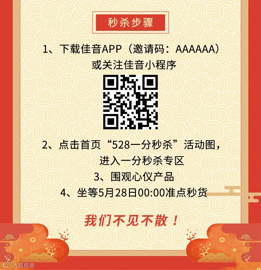 好消息!好消息!佳音“1分秒杀”(5月28日)震撼来袭,200元现金免费送!1000+爆款商品通通只要1分钱,活动当日每个账号可购20单,全场仅限前5000单。限时又限量,拼的是手速,靠的是网速,赶紧关注佳音(佳音APP邀请码:AAAAAA)蹲点抢“钱”吧!