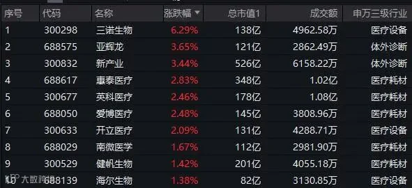 4日早盘,医疗板块继续回暖,领涨两市!中证医疗指数50只成份股中超40股飘红,三诺生物涨超6%居首,亚辉龙、新产业跟涨超3%。