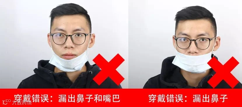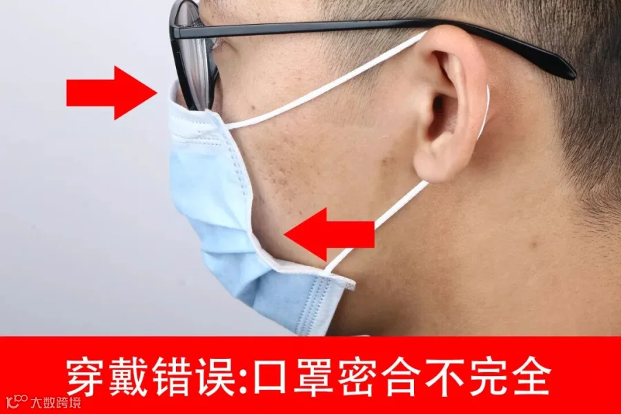对口罩错误的穿戴方法,导致没有完全贴合鼻子和脸部,导致鼻子和脸部周边产生缝隙,在呼吸时极易把污染和有害气体呼入鼻子内,起不到防护效果。
