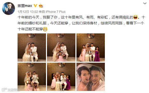 结婚十周年,两人一起穿起了当年结婚时的礼服,娘娘依然少女感十足,而张晋也散发出成熟男人的帅气。