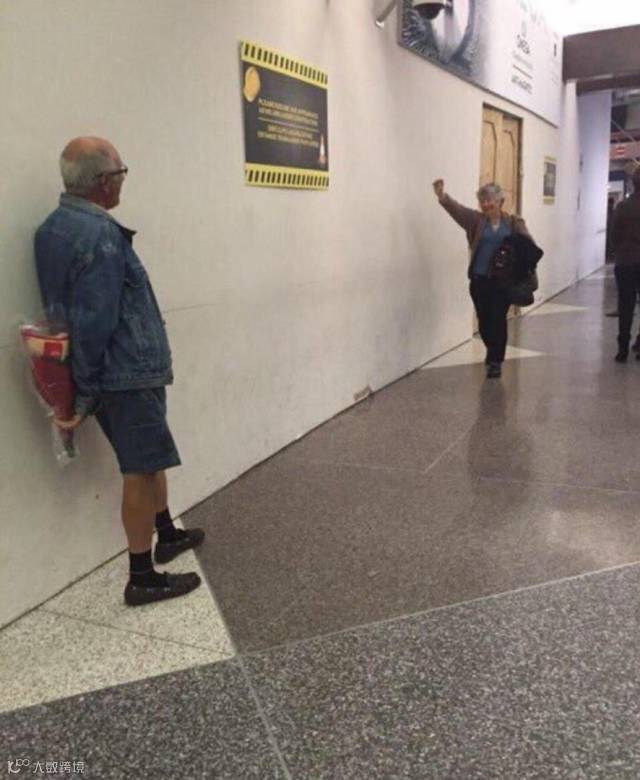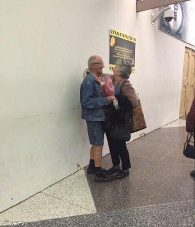 这是国外一网友在火车出站口拍到的,一个老爷爷拿着花接外出归来的老婆回家。