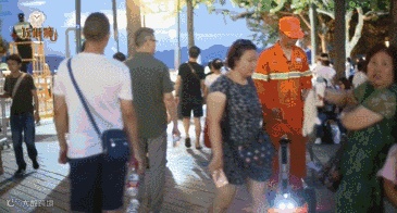 他穿梭在人群中忙碌着,用钳子夹起路上的垃圾,捡起来的饮料瓶也会递给捡破烂的大爷。