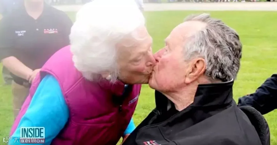 结婚70周年,布什在网络上发了一张芭芭拉亲吻自己的照片写道: