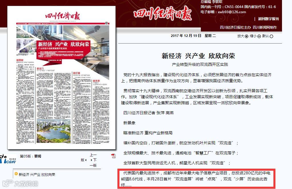 来自四川经济日报12月19日消息,代表国内最先进技术,成都市近年来最大电子信息产业项目,总投资280亿元的中电熊猫8.6代线,首片“双流造屏”将于近期被“点亮”,意味着成都双流“少屏”历史由此告终……