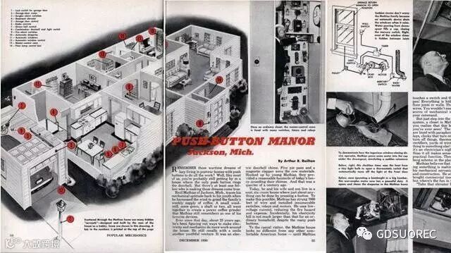 1950年,出现了史上第一个真正具有自动化概念的家居空间,是由机械奇才Emil Mathias in Jackson于1950年在《大众机械》上发布的“按钮庄园”概念,在他的设计中,是一个完全由按钮控制的家居环境,包括了自动窗帘、自动化妆、自动咖啡机等,这个观念给人留下了深刻的印象,但人们并不认为这样的观念可以变为现实。