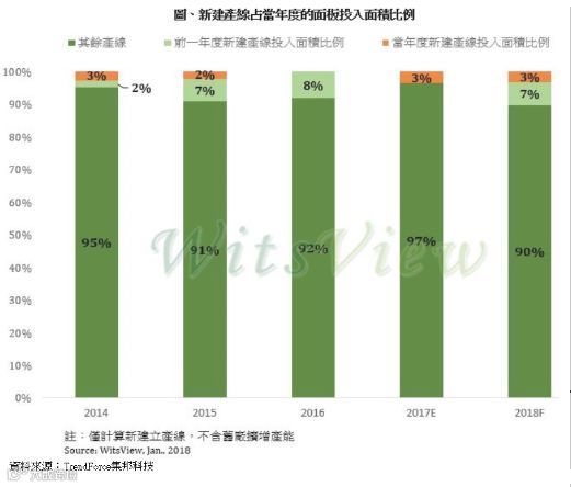 WitsView资深研究经理王靖怡指出,此三条新建产线初期仅会小幅投片,也需要时间提升良率及产能,因此对于2018年的面板投入面积贡献仅约占3%,而对2019年的贡献度则会提高至6%-8%。