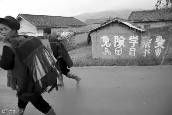 2007年9月,四川省凉山州布拖县,村头刷满免除学杂费的标语,贯彻执行九年义务教育。