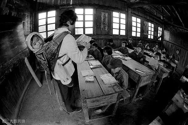 1987年4月,广西壮族自治区融水县安太乡寨怀村小学,戴红英老师把不满五个月的小女儿背着上课。