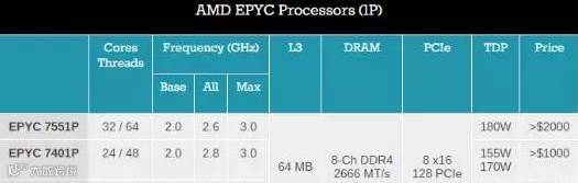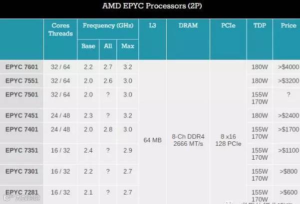2P双路处理器共计9款处理器,最低的是8核16线程的EYPC 7251,基础频率2.1GHz,最高加速频率2.9GHz,TDP 120W,售价不低于400美元。除了它之外,其他8款处理器都是16核、24核到32核,其中最高端的是EPYC 7601,基础频率2.2GHz,四核加速频率2.7GHz,最高频率3.2GHz,TDP 180W,售价4000美元以上。