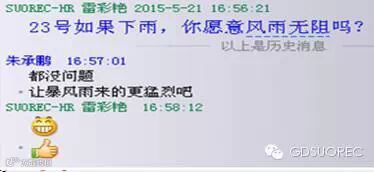 5月23日再次遇上客户方蓝思科技验厂、天气预报发布的暴雨天气,HR为激励大家的斗志发出了风雨无阻的邀请。