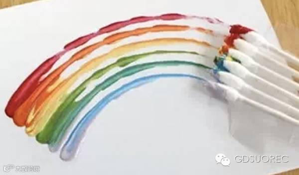 用多彩的颜料粘在棉签上,手画一条半圆的图形,瞧!一条美丽的彩虹出现了!