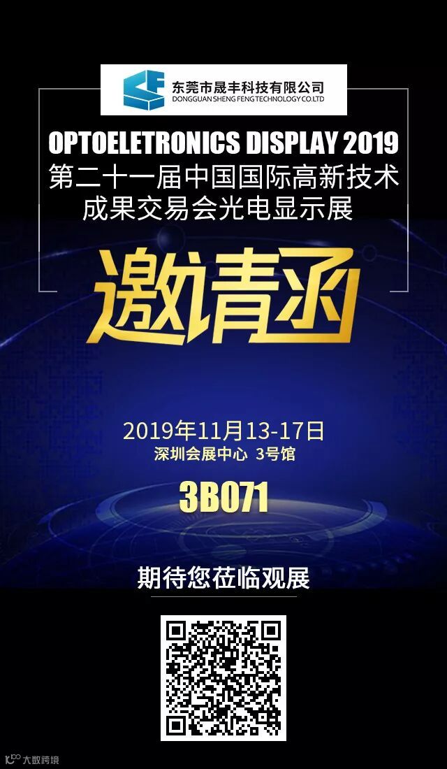 东莞市晟丰科技有限公司将于2019年11月13日至17日参加《第二十一届中国国际高新技术成果交易会光电显示展 2019》。在此诚挚邀请新老客户莅临参观,我司将携带无尘车间净化耗材及设备参展,真诚期待您的到来!