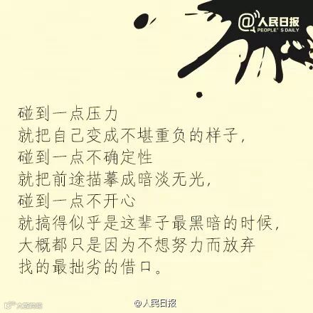 碰到一点压力就把觉得不堪重负,碰到一点不确定性就把前途描摹成暗淡无光,碰到一点不开心就把它搞得似乎是这辈子最黑暗的时候,大概都只是为不想努力而退缩找的最拙劣的借口。想要成功,平凡如你我,除了努力,别无选择。