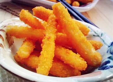 7.锅中倒适量油,油温加至七层左右热,下入地瓜条炸两分钟。