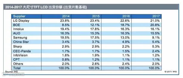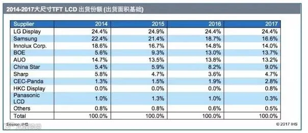 与2016年相比,京东方,华星光电,夏普以及中电熊猫都将在2017年市场份额得到成长。而此前的领导厂商如乐金显示、三星、群创和友达的市场份额都有所下降。