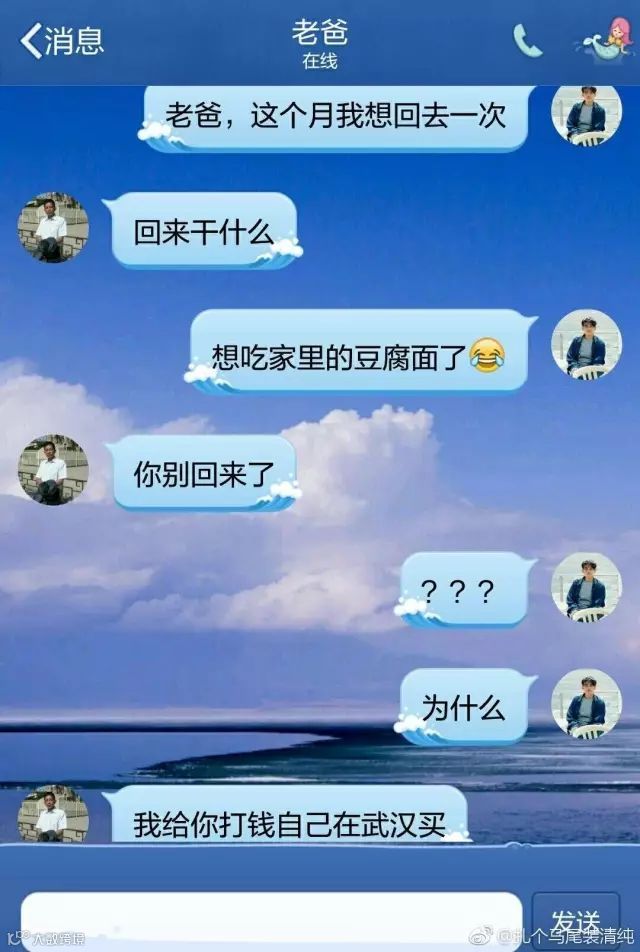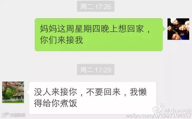 “儿子,回家吃饭不?”我说“马上回来.”结果听到电话那头我妈对我爸说:“老白,那剩饭先别喂狗了,儿子要回家吃饭……”