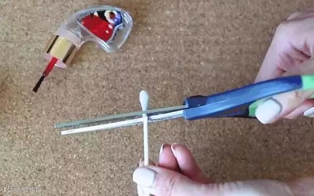 ▼将棉签的一头剪掉,然后粘取指甲油,可以在家自己美甲玩花样。