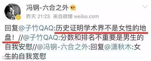 就在网络上引起了轩然大波之时,冯钢老师针对网友的攻击与讨论,一句话又使网络战斗升级:历史证明学术界不是女性的地盘!