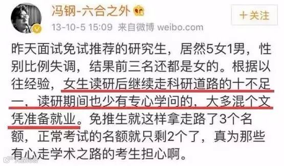 近日,浙江大学社会学博士生导师冯钢因为四年前发布的一条微博被舆论炒到了风口浪尖上,事情的起因是他在2013年微博里的内容有明显的偏激性,经过网络炒作发酵如今又引起热议。他在微博中口无遮拦地把女生与不学无术考研就是为了混文凭和生孩子画上了等号。