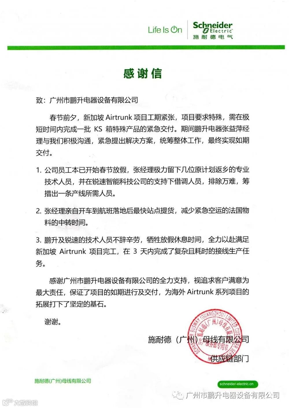 近期,广州市鹏升电器设备有限公司收到客户施耐德(广州)母线有限公司的专门感谢信!春节期间,其特殊项目——新加坡Airtrunk项目,需在极短时间内完成紧急交付。鹏升电器PIU事业部的负责人张益萍经理紧急提出解决方案,统筹整体工作,最终实现如期交付。